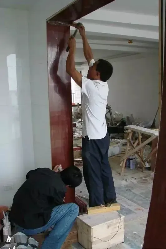 装门的同时要安装的合页、门锁、地吸。实木门的制作周期一般为一个月,所以,为了让工期衔接紧密,要在主体拆改完成之后尽早让木门厂家上门就门洞尺寸进行测量。