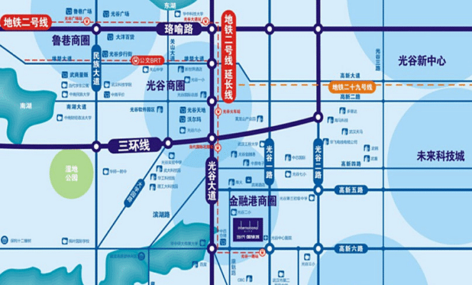 项目旁建设中的地铁2号线南延长线光谷一路站(约100米距离),与有轨电车T1号线高新六路站 (约500米距离),未来将为商铺带来庞大的人流量与消费力,项目集中商业与临街商业分布在主干道上,昭示性强。